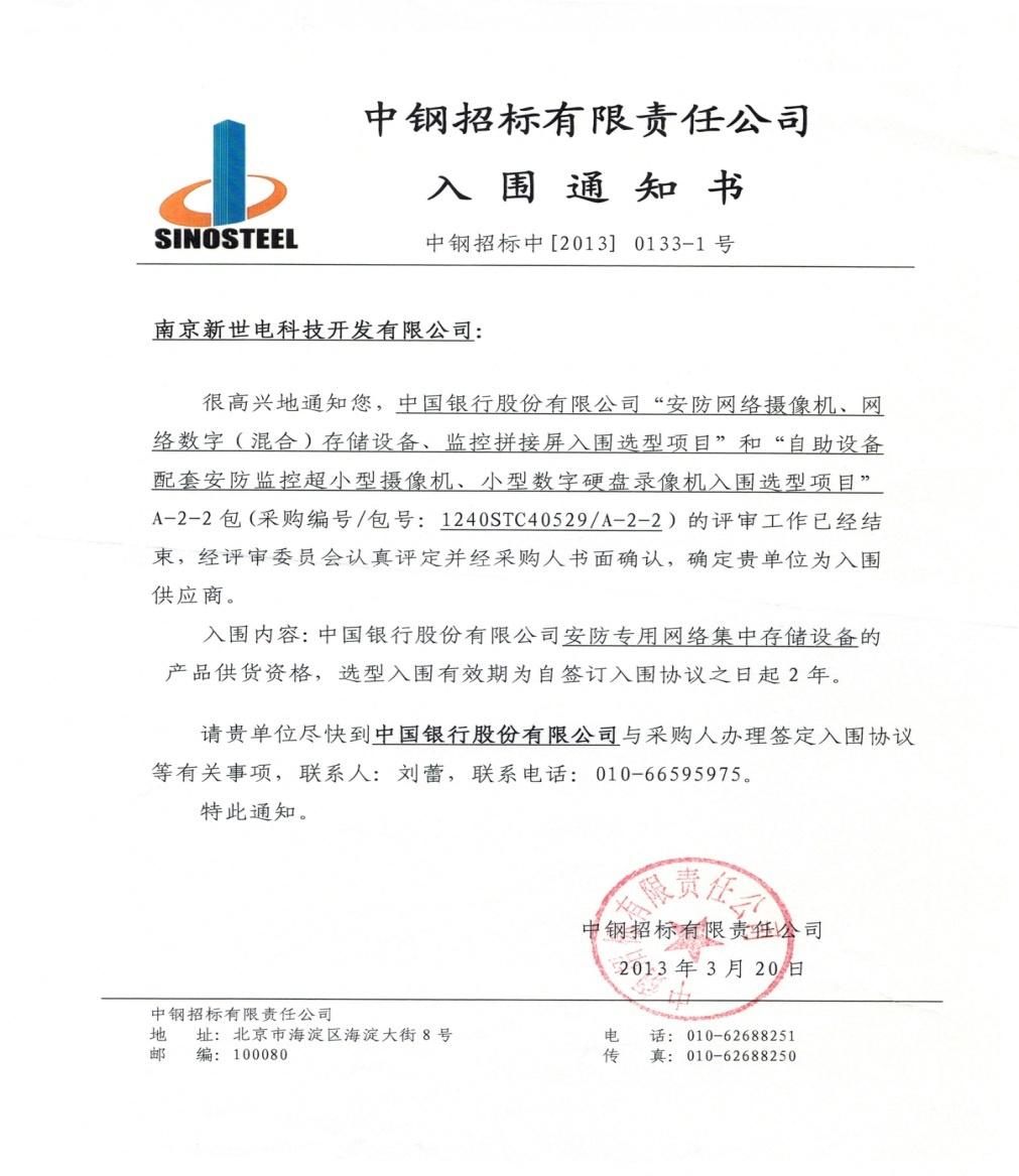 2013年3月20日,公司接到中國銀行總行通知,新世電在中國銀行股份有限公司“安防網(wǎng)絡攝像機、網(wǎng)絡數(shù)字(混合)存儲設備、監(jiān)控拼接屏入圍選型項目”和“自助設備配套安防監(jiān)控超小型攝像機、小型數(shù)字硬盤錄像機入圍選型項目”A-2-2包(采購編號/包號1240STC40529/A-2-2)的競爭性談判采購中,經(jīng)評審委員會認真評定并經(jīng)采購人書面確認,確定新世電為入圍供應商,入圍內(nèi)容:中國銀行股份有限公司安防專用網(wǎng)絡集中存儲設備的產(chǎn)品供貨資格,選型入圍有效期為自簽訂入圍協(xié)議之日起2年。