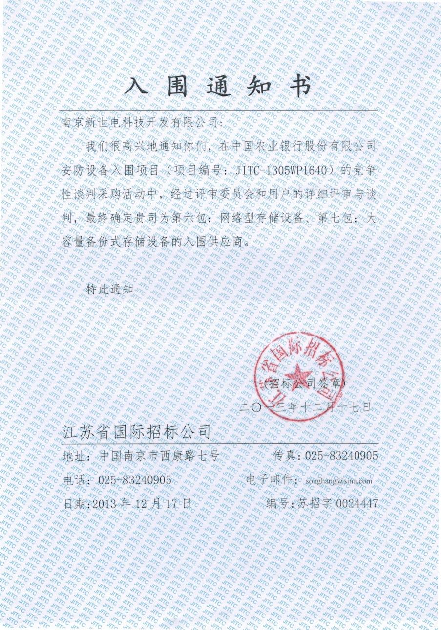 2013年12月17日,公司接到中國農(nóng)業(yè)銀行總行通知,新世電在中國農(nóng)業(yè)銀行股份有限公司安防設備入圍項目(項目編號:JITC-1305WP1640)的競爭性談判采購中,經(jīng)評審委員會和用戶的詳細評審與談判,最終確定新世電為第六包:網(wǎng)絡型存儲設備、第七包:大容量備份式存儲設備的入圍供應商。